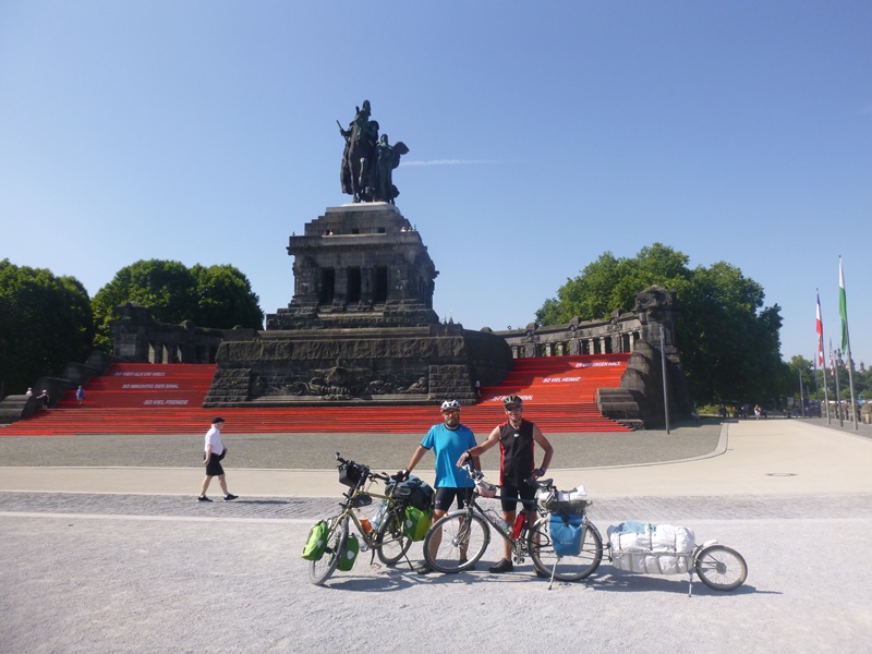 Am „Deutschen Eck“ in Koblenz fließt die Mosel in den Rhein. Wir machen hier eine Pause.