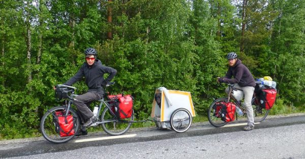 Nach 30 Kilometer treffe ich zwei Schweizer mit Hund. Sie sind über Deutschland und den baltischen Staaten nach Tallin. Von dort nach Helsinki und nun wollen sie nach Süden. In 7 Wochen 3.600 km.