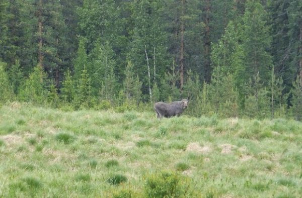 Dann mein erster Elch, ziemlich weit weg. Ich wollte mich nähern … Kamera raus … Auto kommt … Elch rennt fort … ich habe ihn gerade noch so erwischt … So ein Pech! oder Glück!