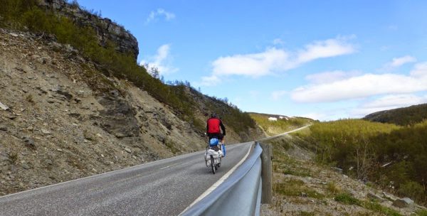 Die heutige Strecke ist sehr anspruchsvoll. Lange steile Anstiege, immer auf und ab, von 0 bis 385 m üNN. Dieser Wechsel geht in die Beine. Ich fahre die E6 entlang. Bloß gut, dass sich meine Achillessehne beruhigt hat. Oben lag noch Schnee.